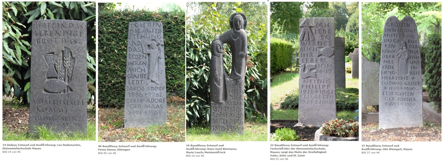 Die drei unteren Steine sind von dem Steinmetz und Freimaurermeister Anton Woger aus Mayen. Er war Leiter der Steinmetzfachschule - die schiefen Schriften finde ich ausgesprochen gut - sollte man aber im Westerwald auf keinen Fall aufstellen, die sind saudumm und können keine 20 Kilometer Luftlinie weit schaun (aber die Mädels hatten süße rote Bäckchen - darum gings wohl).